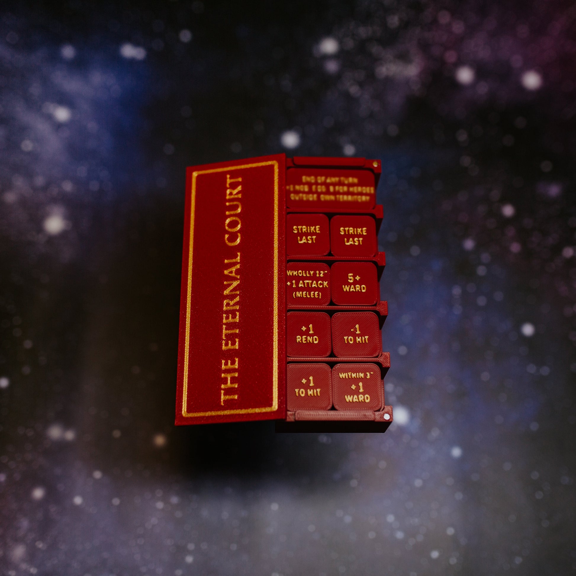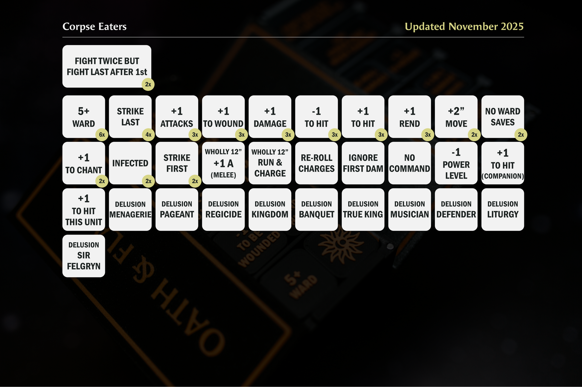 Feast on the fallen with relentless & royal zeal. This 58-token set covers all Corpse Eaters abilities, delusion mechanics, and combat modifiers from the latest rules—so you can focus on overwhelming your enemies with undead hordes, not flipping through rulebooks.