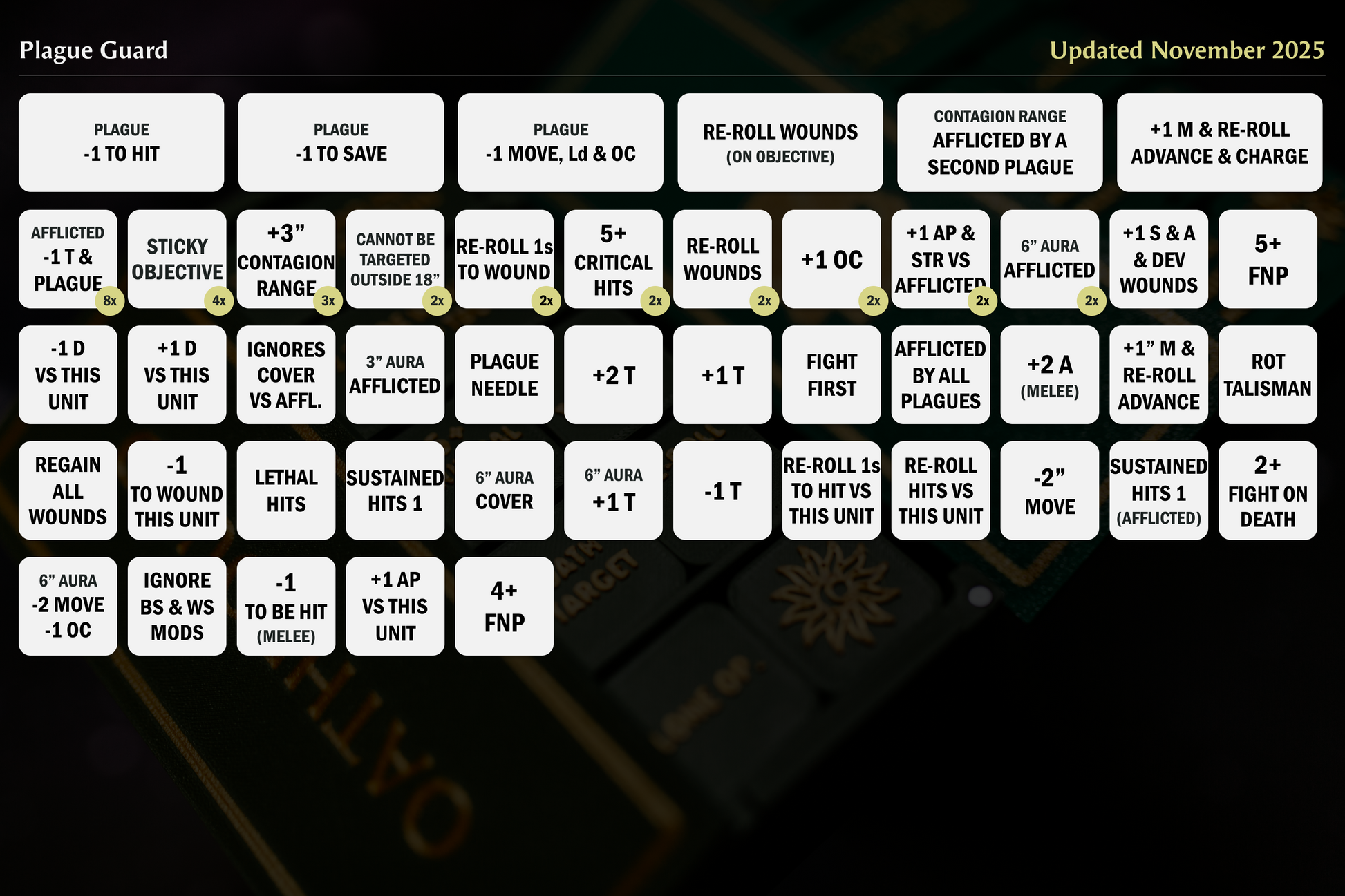 ✓ Plague effect markers (-1 to Hit, -1 to Save, Movement penalties)