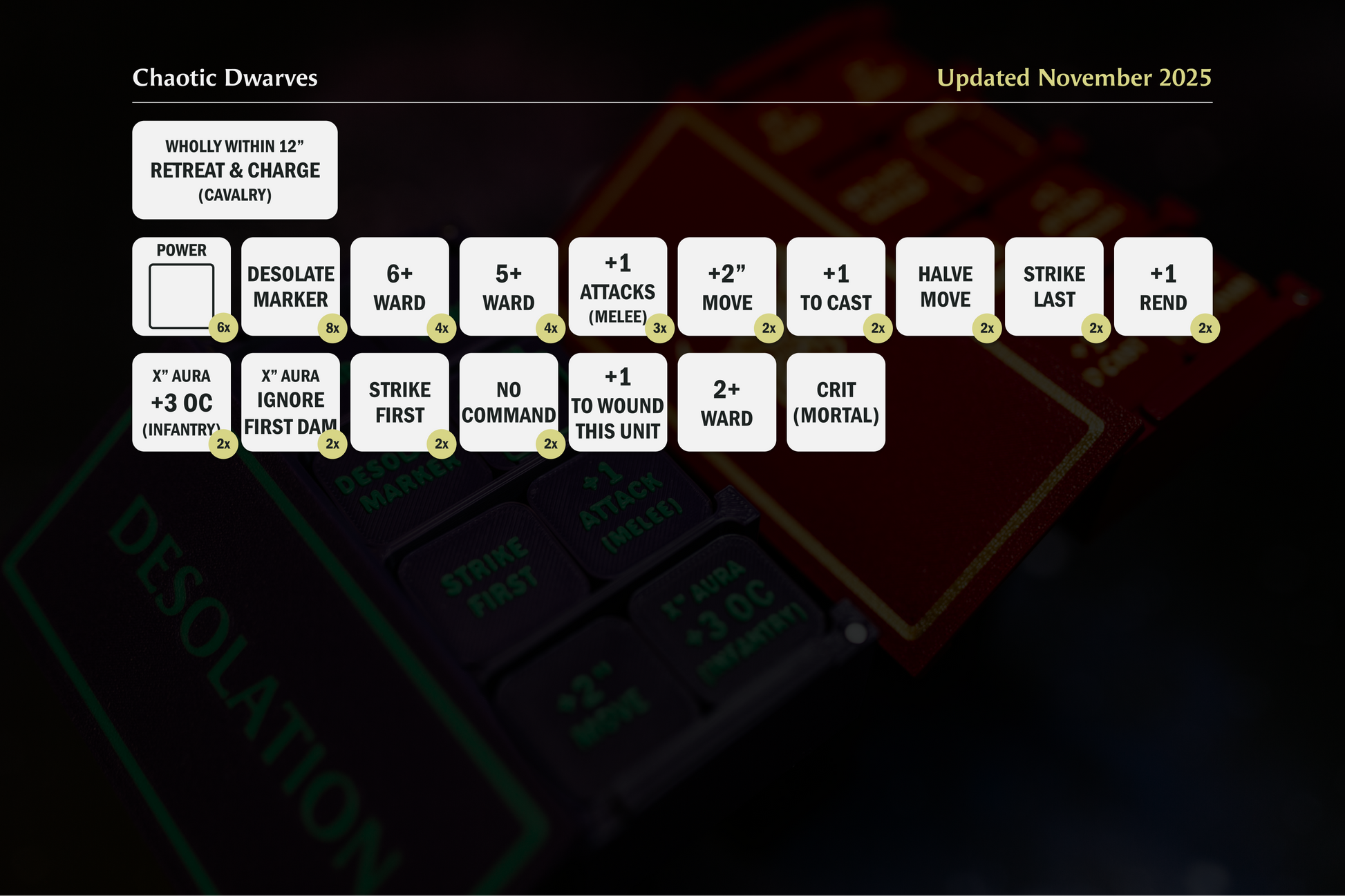 Unleash chaos-infused fury with precision. This 47-token set covers all Chaotic Dwarves abilities, tactics, and daemonic powers—so you can focus on dominating the battlefield, not flipping through rulebooks.