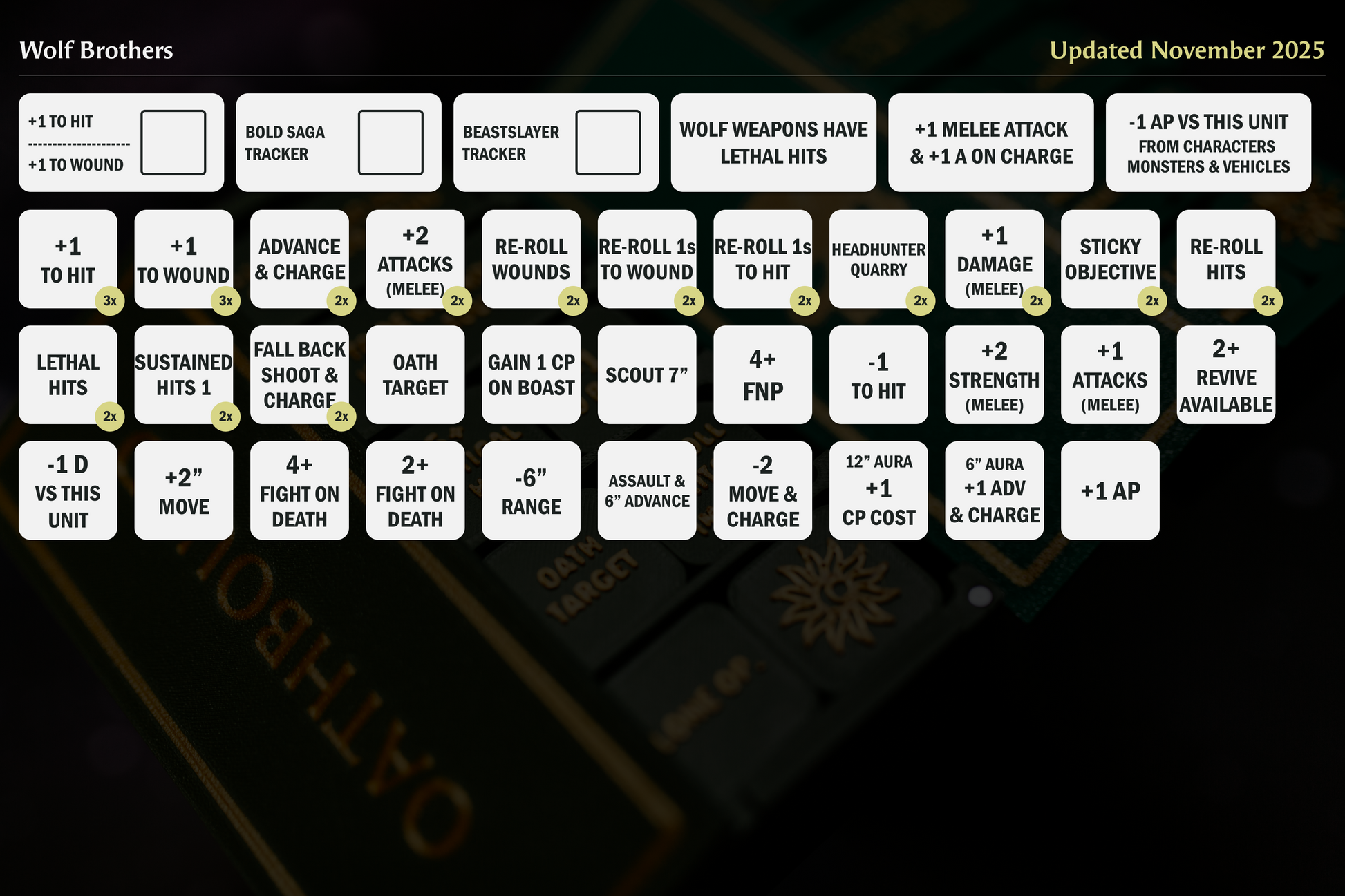 ✓ Defensive markers (4+ FNP, -1 to Hit, Oath Target)